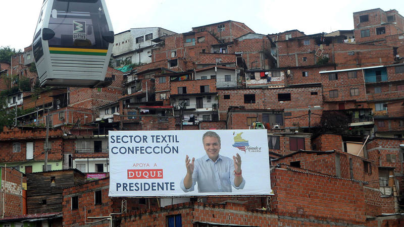 Fotografía de una publicidad del candidato Iván Duque en Medellín.Además son candidatos Sergio Fajardo, de Coalición Colombia, de centroizquierda; Germán Vargas Lleras, del movimiento de centroderecha Mejor Vargas Lleras; Humberto de la Calle, del Partido Liberal; y Jorge Antonio Trujillo, de Todos Somos Colombia.