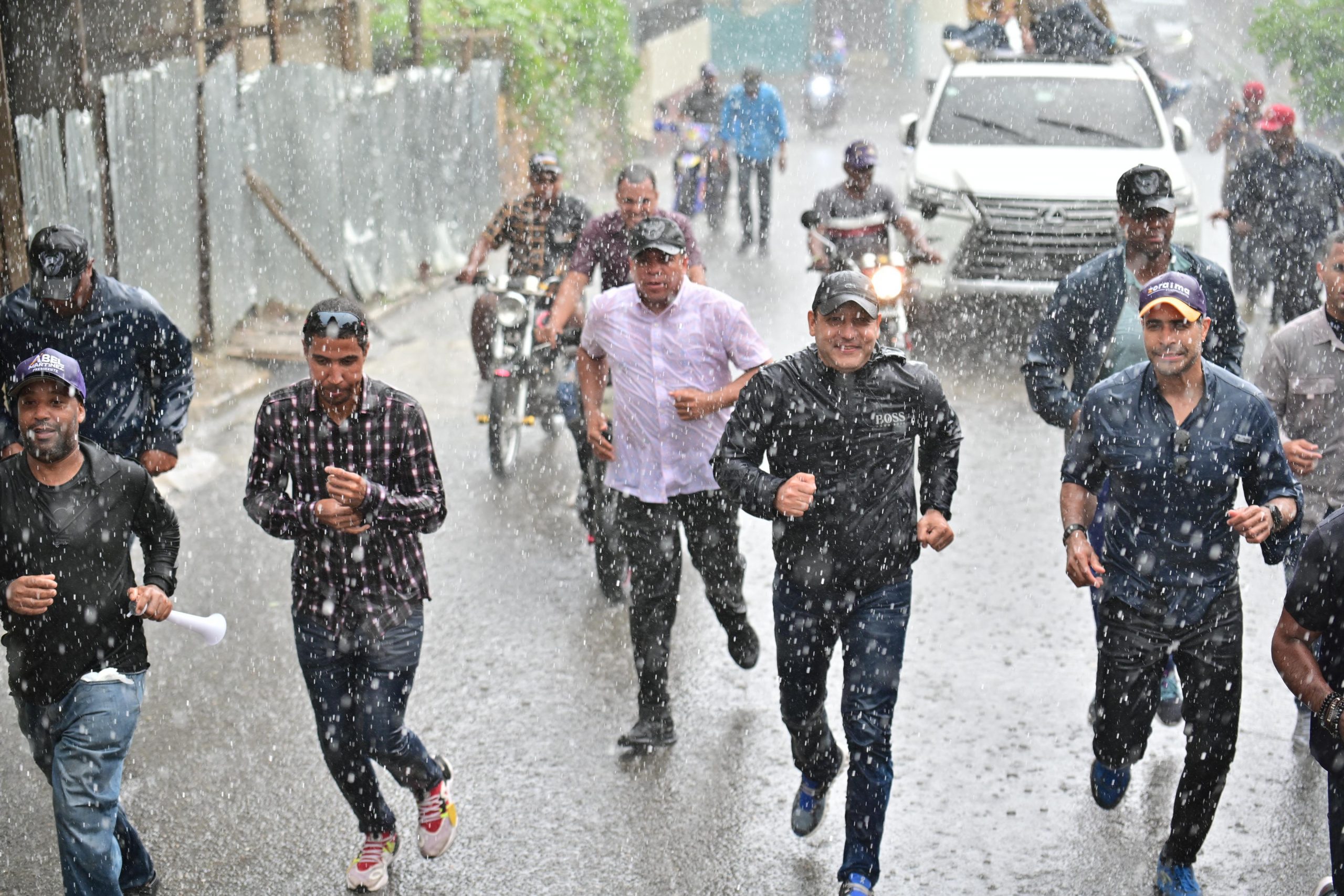 Numerosos miembros y simpatizantes del PLD, empapados de agua, respaldaron al candidato presidencial bajo la consigna “aunque caiga agua, de aquí no se mueve nadie”, mientras ondeaban banderas de este partido y levantaban la mano haciendo la seña del “vota 2”.
