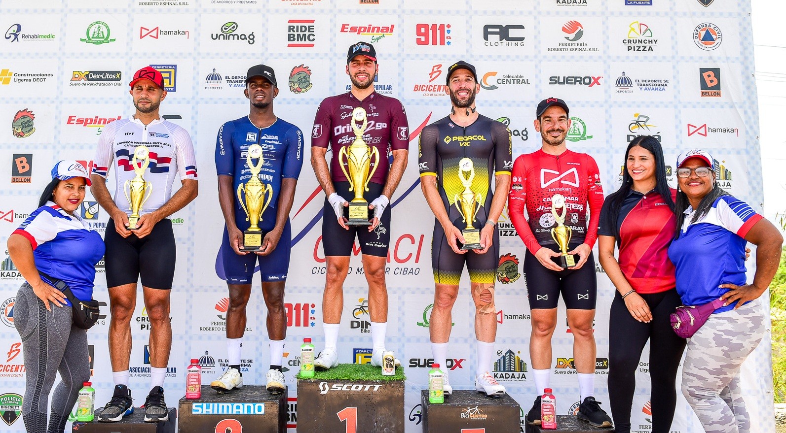 SANTIAGO DE LOS CABALLEROS.- El ciclista Ramón Adames (Drinks Team) superó en el sprint final a Carlos Medina (AC Training) +0.083s y a William Guzmán (PegacolV2C) +0.141s para coronarse campeón Máster A de la 5ta carrera puntuable de la Liga de Ciclismo Master del Cibao (CIMACI) luego de recorrer seis veces el trayecto de Cienfuegos hasta el Peaje (78 kilómetros) en un tiempo de 1:51:34.791.