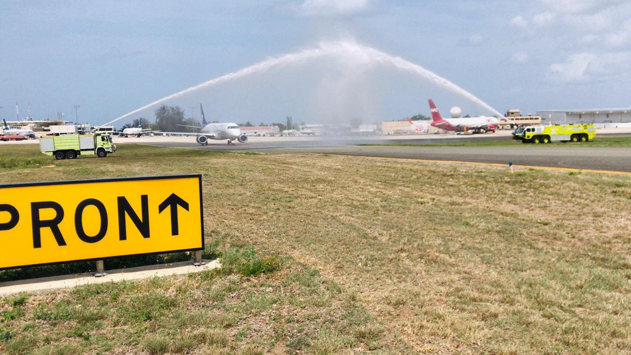 Para celebrar, las autoridades del Aeropuerto Internacional de las Américas realizaron el tradicional baño del avión cuando se encontraba en la calle de rodaje.