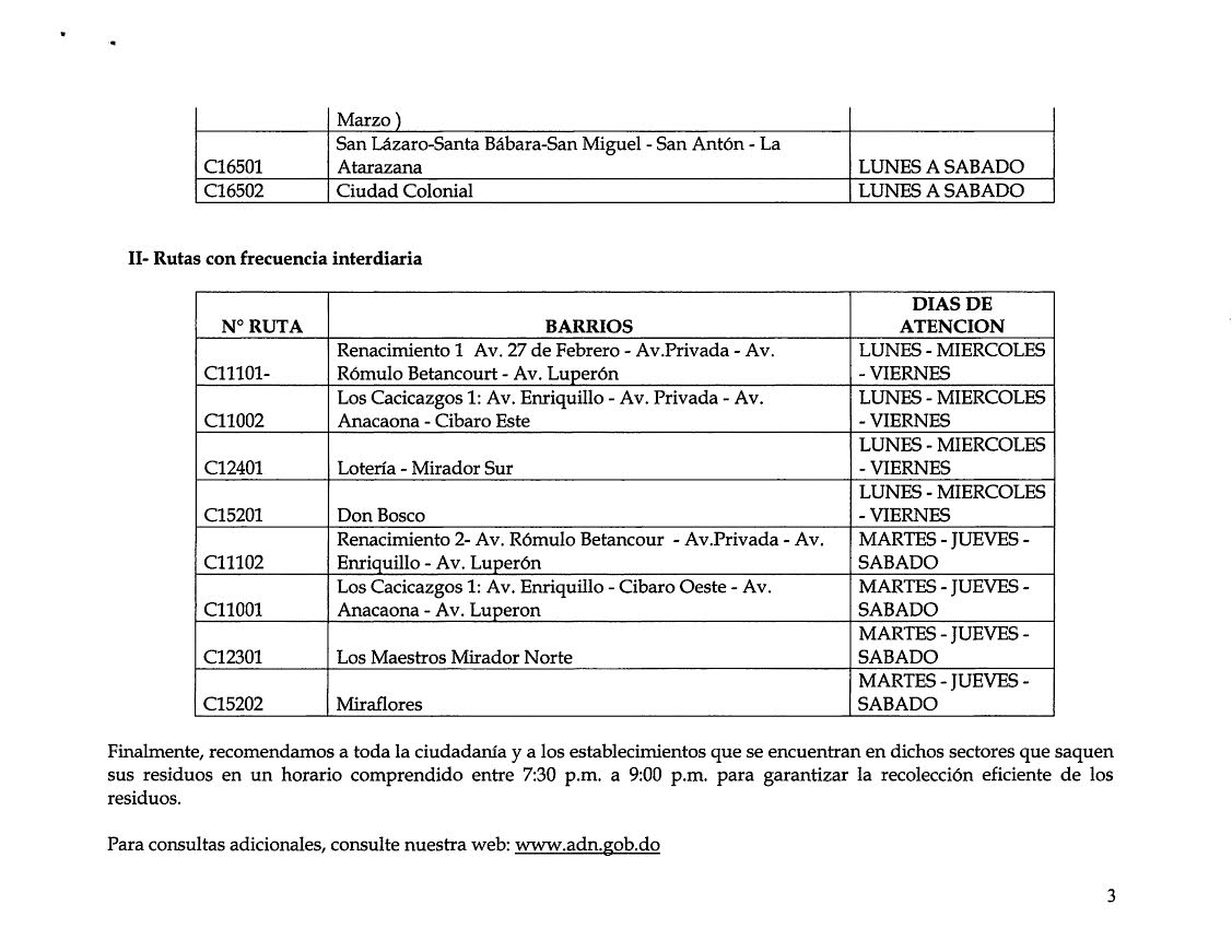 La recogida de basura se programó de acuerdo a las necesidades de los sectores del Distrito Nacional, en base al calendario del mes de noviembre el siguiente:
