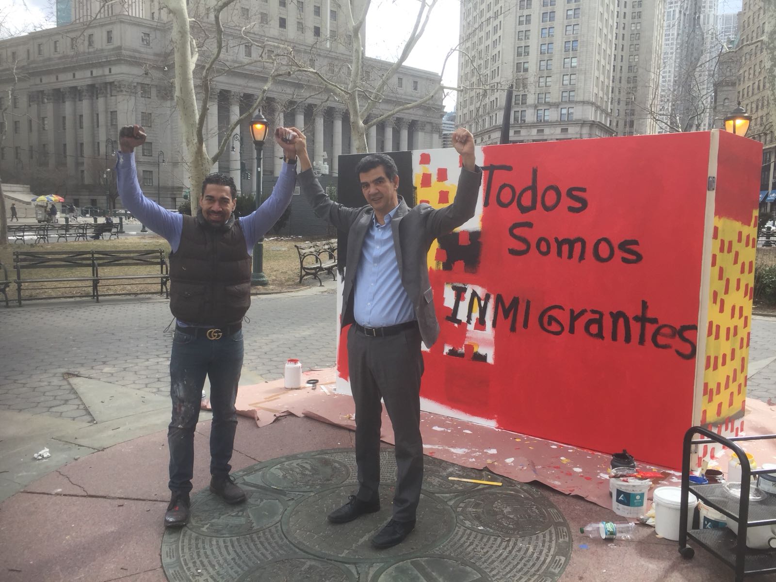 NUEVA YORK.- El reconocido artista dominicano Oscar Abreu impactó con su arte de protesta en el Bajo Manhattan de Nueva York, durante una sección performatica o arte en proceso, donde pintó por más de 7 horas en el centro de Foley Square, mejor conocido como el Parque de Federal Plaza.