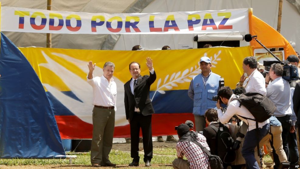 Rodrigo Londoño, jefe de las Fuerzas Armadas Revolucionarias de Colombia (FARC), conocido por el alias Timochenko, se encuentra con el comandante de las FARC, Iván Márquez, ambos del Estado Mayor del grupo alzado en armas.