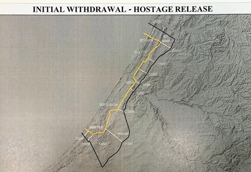 El mensaje de Trump viene acompañado de una imagen del mapa de la Franja de Gaza con una línea amarilla que señala la línea de retirada que habrían aceptado las autoridades israelíes.