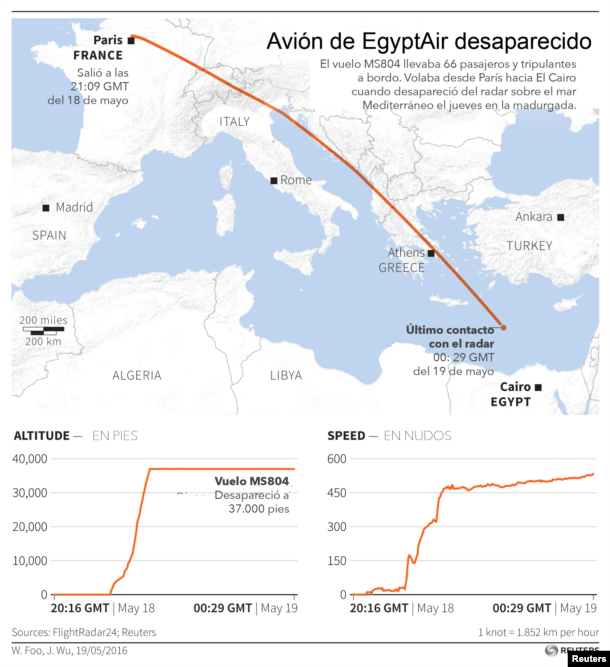 El vuelo MS804 de EgyptAir, con 66 pasajeros y tripulantes a bordo, perdió contacto a las 2:30 am tiempo de El Cairo, cuando volaba a 11.270 kilómetros de altitud, 830 kph y se había adentrado 16 kilómetros en el espacio aéreo egipcio y se ubicaba a unos 280 kilómetros de Alexandria.