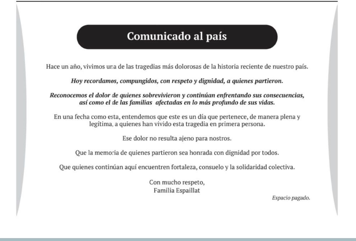 SANTO DOMINGO.- La familia Espaillat emitió un comunicado en el que expone que la tragedia del Jet Set, que cumple un año este miércoles, ha sido una de las más dolorosas de la historia reciente de la República Dominicana.