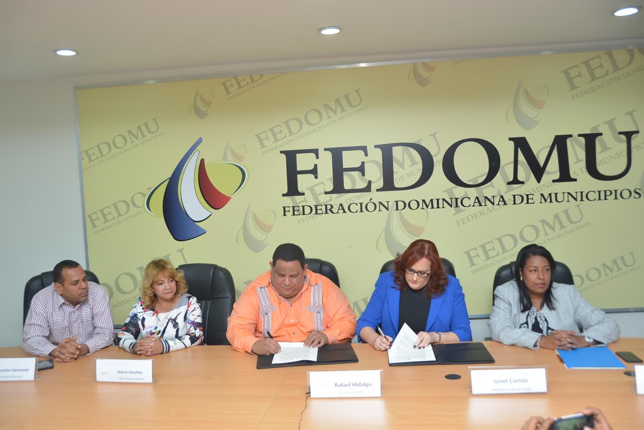 SANTO DOMINGO.- En el marco de la conmemoración del Día Internacional de la Mujer, el Ministerio de la Mujer (MMUJER) y la Federación Dominicana de Municipios (FEDOMU) firmaron un acuerdo de cooperación interinstitucional destinado a trabajar de manera conjunta en la sensibilización y empoderamiento de las autoridades municipales para el fortalecimiento de los aspectos relacionados con la gobernabilidad y equidad de género en cada uno de los municipios del país.