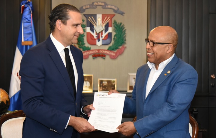Servio Tulio Castaños Guzmán, vicepresidente ejecutivo de FINJUS, entregó un documento a Alfredo Pacheco, presidente de dicha Cámara, y a la vez le felicitó por los esfuerzos que hace encaminados a una producción legislativa de cara al fortalecimiento institucional de República Dominicana.