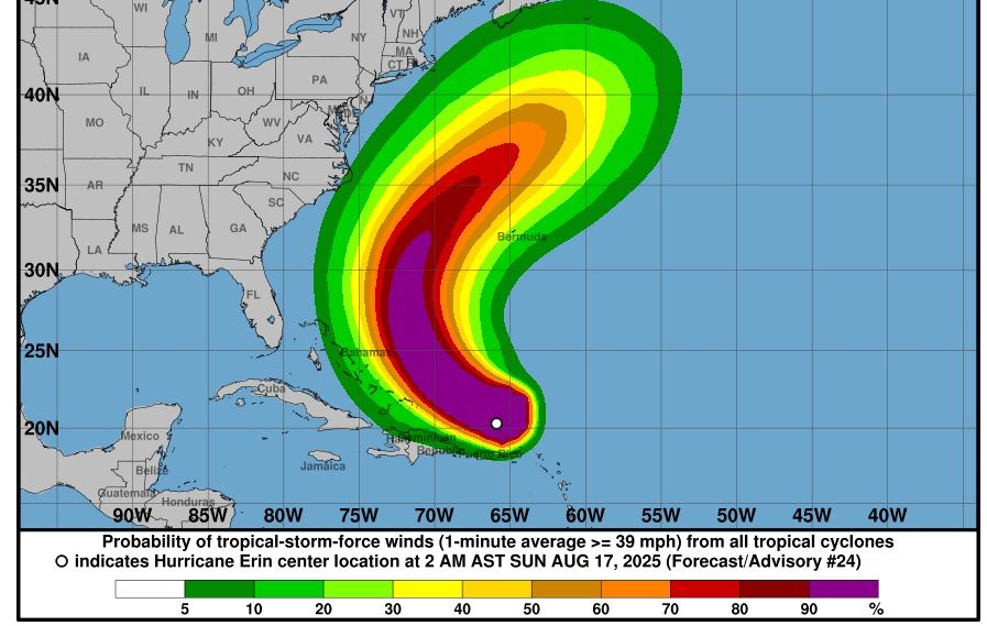 MIAMI, Estados Unidos, 17 Ago. (EUROPA PRESS) – El huracán ‘Erin’, el primero de la temporada atlántica, ha reducido su intensidad en las últimas horas, lo que ha permitido al Centro Nacional de Huracanes (CNH) de Estados Unidos rebajarlo de categoría cinco –la máxima– de la escala de Saffir Simpson a categoría cuatro.