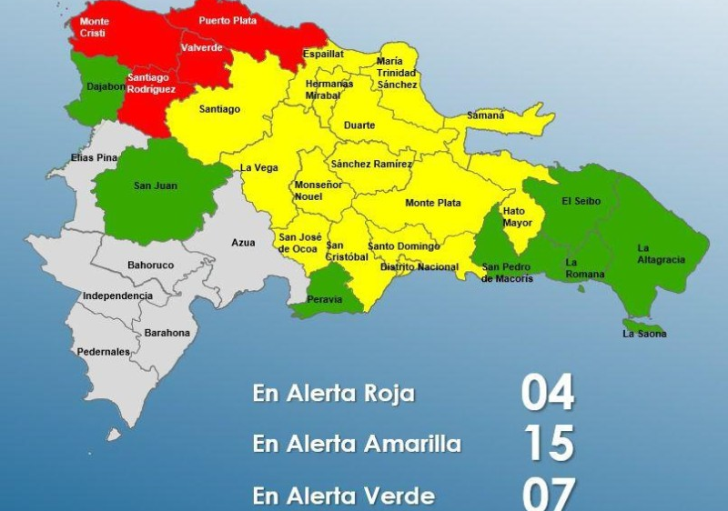 En alerta roja están las provincias Montecristi, Valverde, Santiago Rodríguez y Puerto Plata. En amarilla María Trinidad Sánchez, Santiago, Duarte (en especial el Bajo Yuna), San Cristóbal, Hermanas Mirabal, Hato Mayor, Distrito Nacional, Monte Plata, Monseñor Nouel, La Vega, Sánchez Ramírez, Espaillat, Samaná, Santo Domingo y San José de Ocoa.