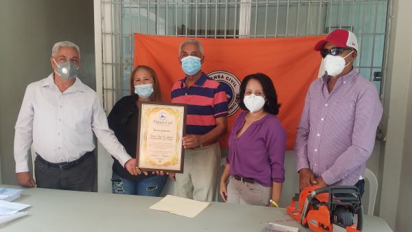 La directora local de la Defensa Civil, Reyna María Adames, sorprendió a los ejecutivos del Consejo de Apoyo a Jarabacoa con el pergamino. Adames dijo que la entidad presidida por Tejeda se ha convertido en un bastón de apoyo porque siempre está presente en los momentos necesarios.