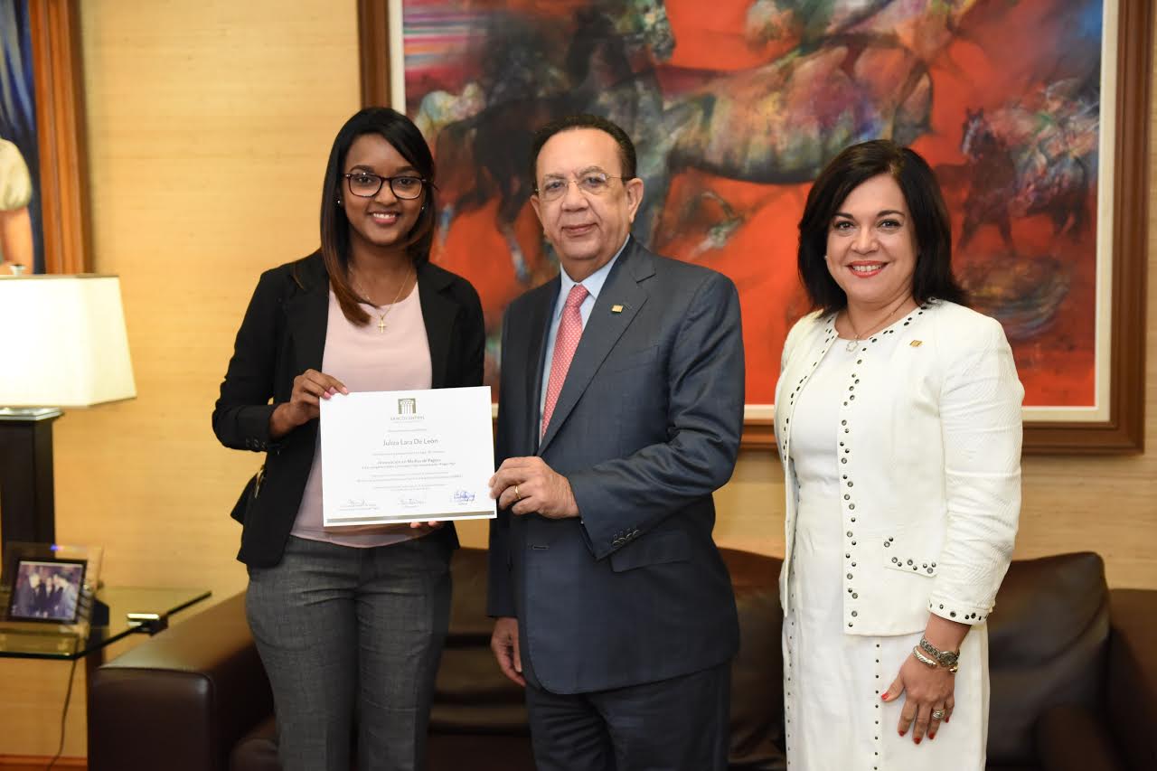 SANTO DOMINGO.- La joven Juliza Lara de León recibió en manos de Héctor Valdez Albizu, gobernador del Banco Central de la República Dominicana (BCRD), un diploma y RD$100,000 mil pesos en reconocimiento a su trabajo presentado al concurso “Innovación en medios de pagos”, competición instituida por el departamento de Sistemas de Pagos y Liquidación de Valores de la República Dominicana (SIPARD).