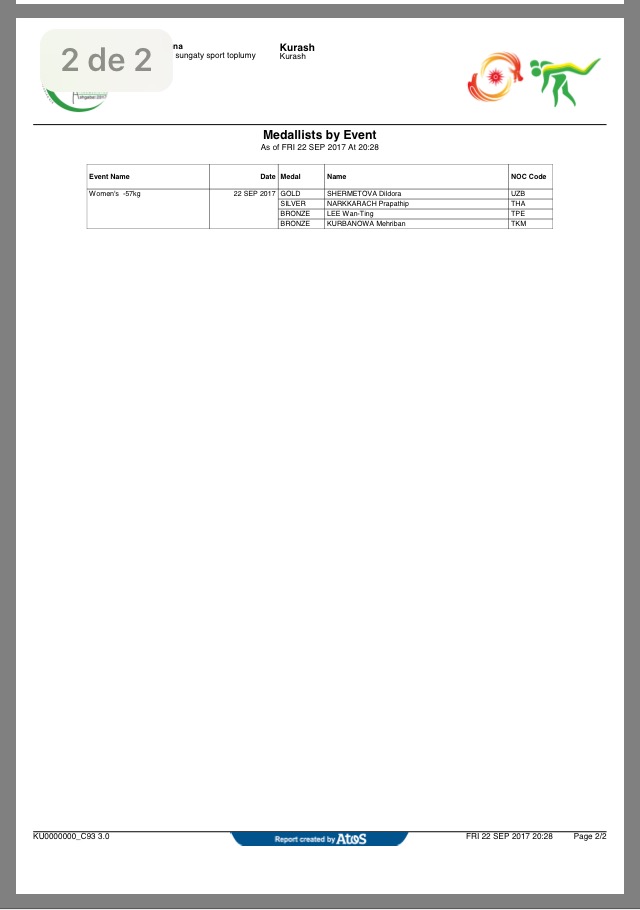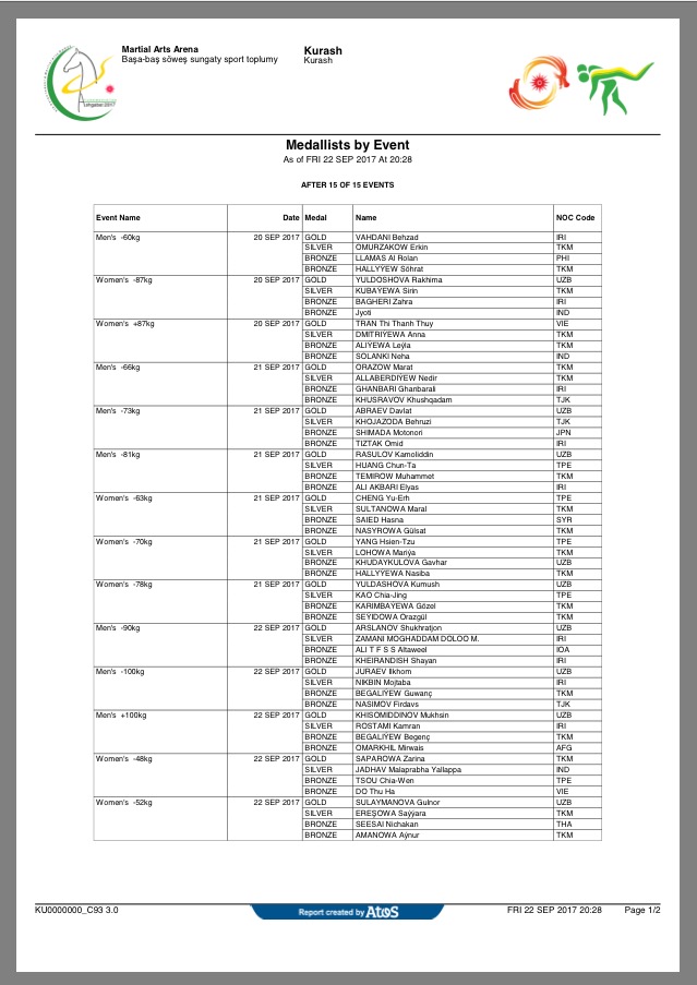 ASHGABAT, Turkmenistan.- Los días 20, 21 y 22 de septiembre 2017 la disciplina de Kurash tuvo las competiciones de los V Juegos Asiáticos Bajo Techo y de las Artes Marciales, con la regencia del Consejo Olímpico de Asia, que preside el jeque Ahmed Al-Fahad Al-Ahmed Al-Sabah.