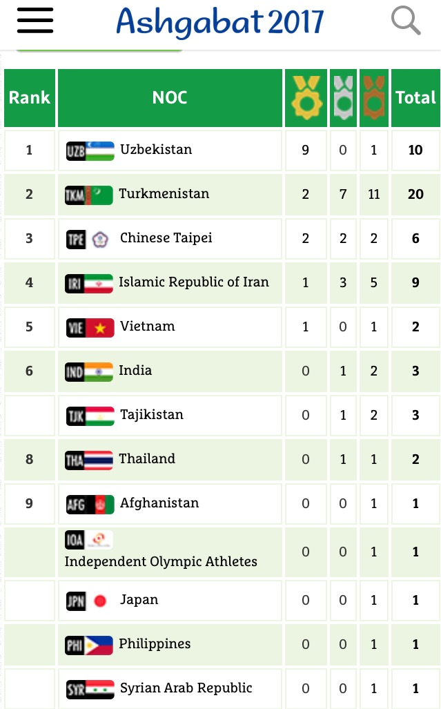 Por otro lado a los organizadores de estos juegos, Turkmenistan, le correspondió la segunda posición con dos preseas doradas, siete de plata y 11 de bronce.