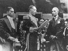 En el extremo izquierdo de la fotografía aparece Mario Fermín Cabral, quien tiene en sus manos el protocolo oficial y procede a tomar juramento al brigadier Rafael Leónidas Trujillo como presidente constitucional. La postura firme de Cabrera, la posición elevada de la mano de Trujillo y el orden ceremonial de la escena transmiten la solemnidad del momento, inmortalizando el instante en que se iniciaba un nuevo ciclo político en la República Dominicana.