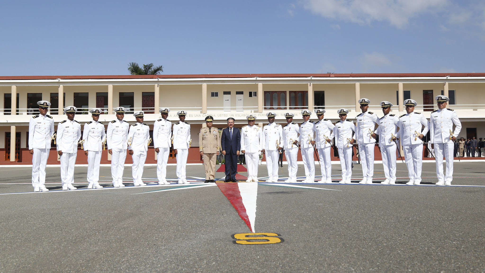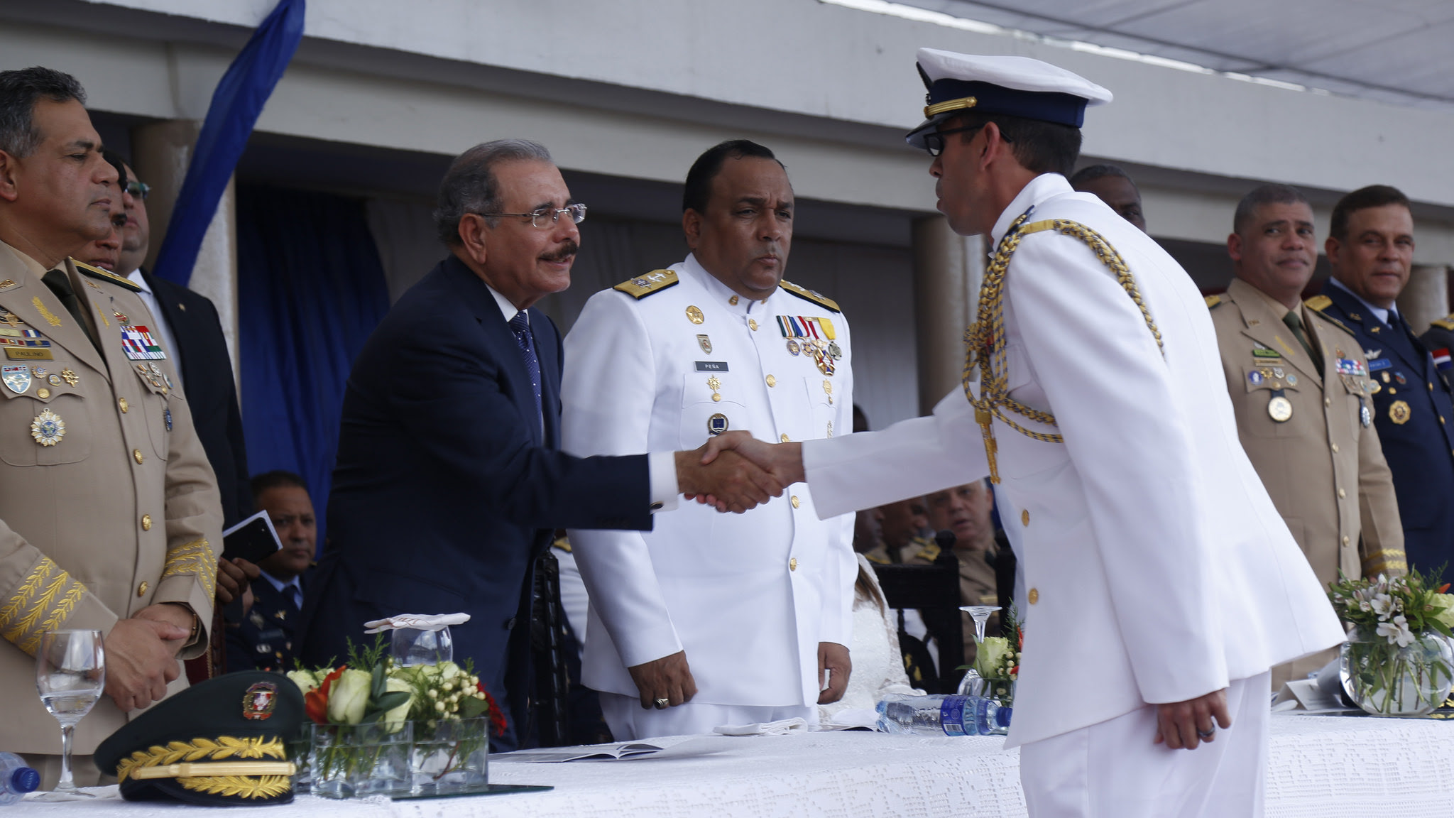 Posteriormente el presidente Danilo Medina tomó el juramento. De igual modo la entrega de los sables de mando. Se graduan en Ciencias Navales y el rango de tenientes de corbeta.EFE