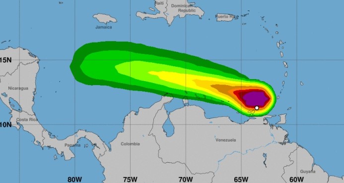 Se desplaza hacia el oeste-noroeste con una velocidad de traslación de 33 km/h y, según un probable patrón de trayectoria, el centro de la tormenta “o sus remanentes continuarán desplazándose a lo largo de sureste del Caribe durante los próximos dos días”.
