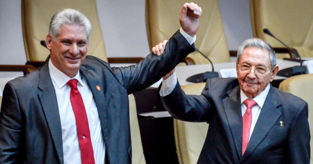 Newly elected Cuban President Miguel Diaz-Canel reacts as former Cuban President Raul Castro raises his hand during the National Assembly in Havana