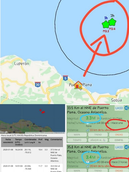 Asimismo, a las 4:24 minutos de la tarde se registró un tercero de 3.3 grados a 37.5 kilómetros al Nor/Nordeste con una profundidad de 18.4 kilómetros, en la latitud 20.116 Norte y longitud -70.612 grados.