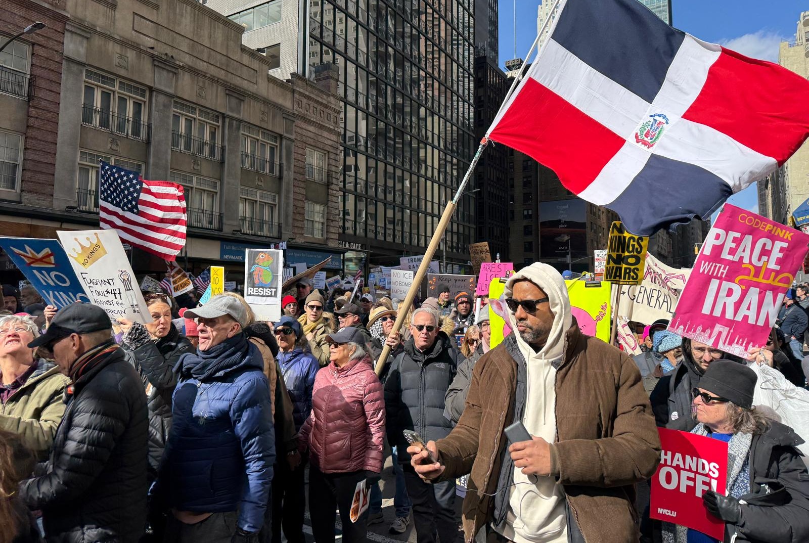 Los manifestantes reiteraron su condena a la deriva autoritaria de la actual administración encabezada por Donald Trump, su abuso en el ejercicio de poder y sus guerras contra los inmigrantes a nivel interno y contra de Irán a nivel externo.