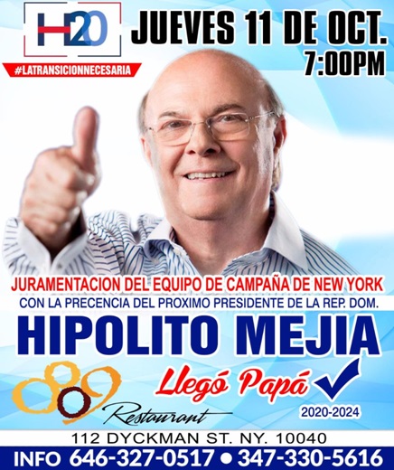 ►¿Le negaron local a Hipólito en NY?: La llegada de Hipólito Mejía a NY está siendo anunciada y promovida por el mismo “grupo” de compañeros que en las elecciones pasadas le hizo la campaña a Danilo Medina, rechazando a Luis Abinader como el candidato presidencial del PRM. José Peralta Plasencia es el coordinador general de H-20 (La ex Maquinaria), un grupo que muchos políticos en la Gran Manzana lo catalogan de ABM (Allante, Bulto y Movimiento), que en el 2016 proclamó: “somos una especie de guardia imperial al servicio de la reelección”. ¡Ay! ¡ay! ¡ay! Una fuente