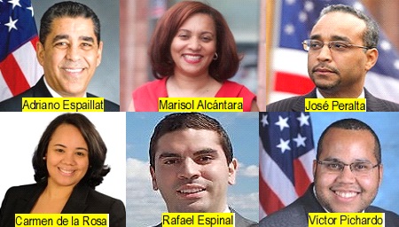 ►Actuales candidatos dominicanos por NYC: Los candidatos dominicanos a diferentes cargos electivos en las elecciones de este martes día 8 son seguros ganadores en NYC. Adriano Espaillat al Congreso Federal; Marisol Alcántara y José Peralta al Senado Estatal; Carmen de la Rosa, Víctor Pichardo, y Rafael Espinal, a la Asamblea Estatal. En NYC hay 4,927,363 personas aptas para votar. De esa cantidad en Manhattan hay 1,126,400; El Bronx tiene 782,406; Brooklyn 1,526,514; Queens 1,192,529; y Staten Island 299,514. El Partido Demócrata tiene 3,343,041 y el Republicano 501,976. Los dominicanos con derecho a votar en NY son 250,122, y el 90% son demócratas. El resto de 1,082,346 pertenecen a otras organizaciones pequeñas, votos nulos y abstención. Hay que destacar que en todo el estado hay 11 millones 726,842 personas inscrita. Los demócratas son 5,792.497 y los republicanos 2,731.688. El resto de 3,202.657 están distribuidos entre las demás organizaciones políticas pequeñas, los votos nulos y la abstención.