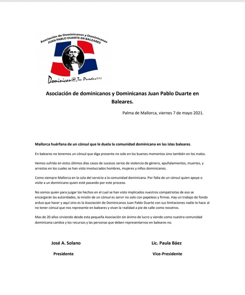 La denuncia fue hecha por Paula Báez, vicepresidente de la Asociación de Dominicanos en Islas Baleares, quien aseguró que los dominicanos residentes aquí no reciben atenciones de sus autoridades consulares, ya que estos se encuentran trabajando a pleno pulmón sin la ayuda de su gobierno.