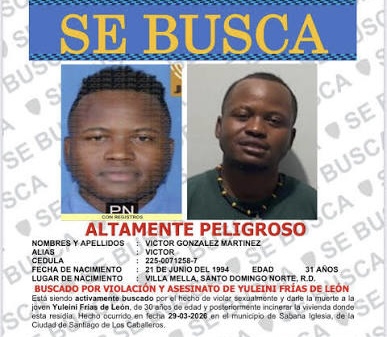 Santo Domingo, 29 mar (EFE).- La Policía Nacional informó este domingo de que busca a un hombre acusado de violar y matar a una mujer, identificada como Yuleini Frías de León, de 30 años, en el municipio de Sabana Iglesia, provincia Santiago de los Caballeros