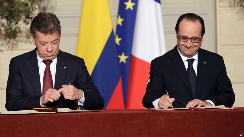 El presidente colombiano, Juan Manuel Santos y el presidente francés, Francois Hollande, firman acuerdos al final de su reunión en el Palacio del Eliseo en París, el lunes 26 de enero de 2015.
