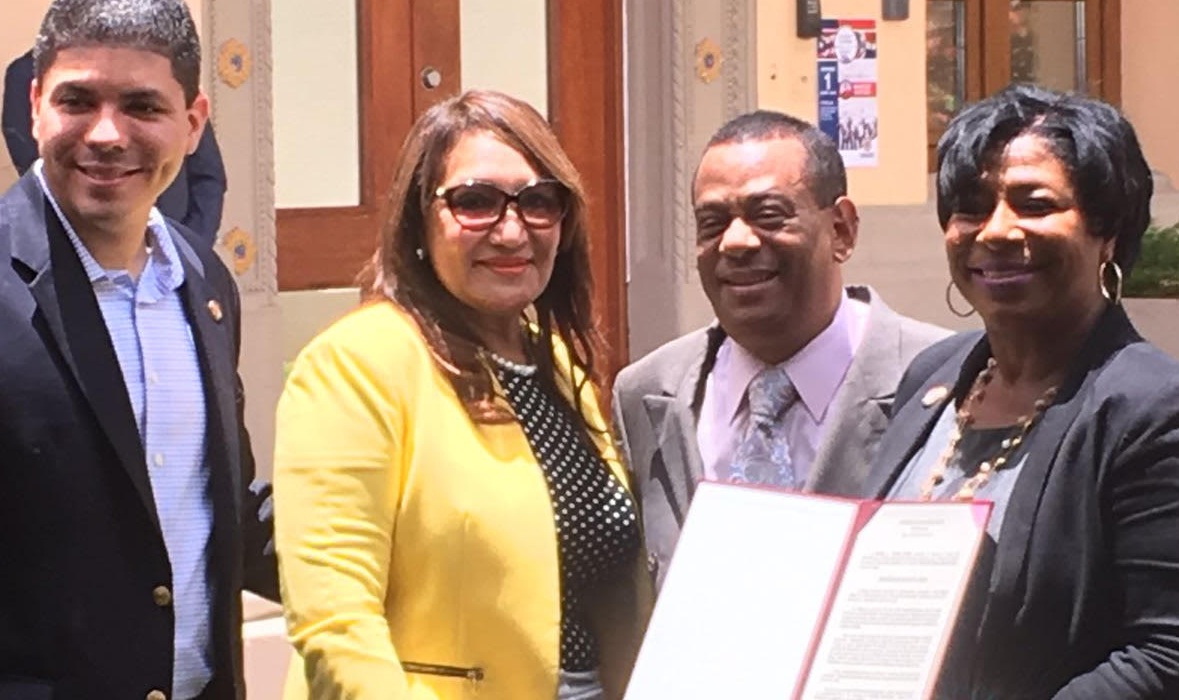Los senadores Nayda Venegas Brown y Edie Charbonier entregaron la moción a Rubén Suriel Gómez, junto a la pastora Keren Riquelme.
