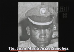 Ya esperando para ser interrogada y sola en una oficina, ubicada al lado de otra donde se escuchaba a oficiales dando las “órdenes del día”, y con un centinela cuidando la puerta; asomo la cabeza y veo venir por el pasillo a algunos policías y entre ellos reconozco a uno, que se impresiona al verme y da un paso atrás para cubrirse. El corazón me da un vuelco y retrocedo hacia adentro de la oficina y me quito de la vista porque sabía que debían pasar por mi frente para llegar hasta donde se escuchaba hablando al Coronel Caonabo Reynoso Rosario, quien momentos antes había mandado a por mí. Cuando van cruzando por el pasillo, los observo sin que me vean y reconfirmo que ahí va el que le dio el tiro de gracias a Homero, y que con su tufo a pólvora y a ron manejó nuestro carro. Era el teniente de la Policía, Juan María Arias Sánchez, aunque en esos momentos aún yo no conocía su nombre; mismo personaje que pocos meses después mató al periodista Gregorio García Castro (Goyito)