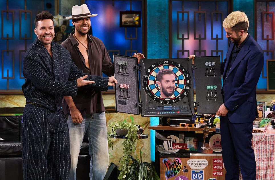 Los artistas han regalado a Broncano «una pieza exclusiva, única en el mundo», una diana de dardos oculta tras la portada de su disco y con la cara del presentador en el centro, «para cuando nos preguntes por el dinero y el sexo», bromeaban. Un presente con doble y hasta triple sentido, ya que da nombre a la canción que han interpretado en el programa, «Dardos», que supera ya los 50 millones de reproducciones.