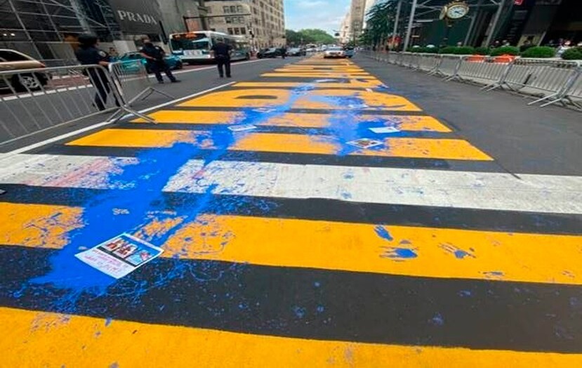 En el incidente más reciente, dos mujeres fueron arrestadas el sábado alrededor de las 3:00 de la tarde cuando, de acuerdo con la policía, vertían pintura negra sobre el mural, de casi una cuadra de largo afuera de la Torre Trump, en la elegante Quinta Avenida en Manhattan.